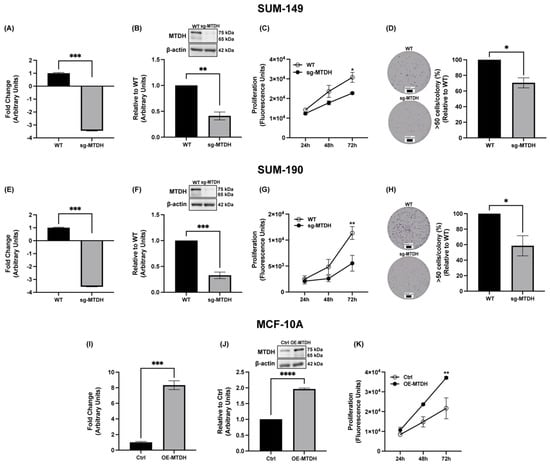 Several publications have highlighted MTDH as an important target in the treatment of BC, including its role in cancer onset and progression [,]. Therefore, our objective is to elucidate the cellular and molecular functions that MTDH plays in IBC. We hypothesized that knocking out MTDH in IBC cells would decrease proliferation and their capacity to form colonies. Here, we developed a MTDH CRISPR/Cas9-based knockout cell line (sg-MTDH) using SUM-149 and SUM-190 IBC cells. To test our hypothesis, we compared their expression with wild-type (WT) cells. The knockout of the MTDH gene in SUM-149 and SUM-190 was validated by qPCR and immunoblotting (Figure 2A,B,E,F). IBC sg-MTDH SUM-149 cells show a significant decrease in gene expression levels (−3.44 f.ch.) and protein expression levels (59%) compared to WT. Similarly, sg-MTDH SUM-190 IBC cells showed a significant reduction in gene expression (−3.56 f.ch.) and protein expression levels (67%) compared to WT. To test differences in cell proliferation capacity, we monitored SUM-149 and SUM-190 (WT and sg-MTDH) for 24, 48, and 72 h. The results showed that the proliferative capacity of SUM-149 (26%) and SUM-190 (51%) was significantly reduced at 72 h in the sg-MTDH cell model (Figure 2C,G). Consistent with the proliferation results, the clonogenicity of MTDH-depleted cells was significantly reduced compared to WT cells (Figure 2D,H). Furthermore, we hypothesized that the overexpression of MTDH in normal cells would promote malignant alterations. To investigate the malignant effects of MTDH in normal cells, we overexpressed MTDH in the non-cancerous mammary epithelial cell line, MCF-10A. We confirm the overexpression of MTDH in MCF-10A cells by performing qPCR and immunoblotting for both control cells (Ctrl) and overexpressed cells (OE-MTDH) (Figure 2I,J). The results showed a significant increase in gene expression (8.33 f.ch.) and protein expression (96%) in OE-MTDH cells compared to Ctrl. As predicted, the proliferative capacity of OE-MTDH increased significantly (72%) compared to Ctrl cells. These results suggest that the depletion of MTDH in IBC cells is directly related to the proliferative capacity of IBC cells in short and long periods of time.