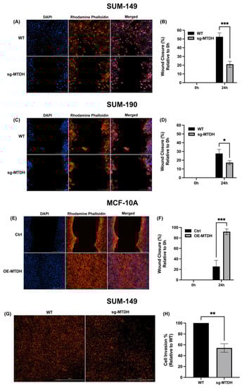 MTDH overexpression has been associated with increased cancer cell metastasis []. Therefore, we evaluated the effects of MTDH knockout on the migration and invasion potential of IBC cells. We performed a 24 h wound healing assay using SUM-149 and SUM-190 cell lines (WT and sg-MTDH). The results showed a significant reduction in the percent of wound closure of the sg-MTDH cell model in both SUM-149 (79% reduction) and SUM-190 (83% reduction) cells (Figure 4A–D), suggesting that there is a reduction in the IBC cell migration capacity. We also investigated whether MTDH overexpression promotes the migration of non-cancerous cells MCF-10A. The results showed a significant alteration in the ability of OE-MTDH (92% increase) cells to close the wound compared to Ctrl MCF-10A cells (Figure 4E,F). Next, we assessed the effects of the absence of MTDH on IBC cell invasion using a transwell assay with SUM-149 WT and sg-MTDH cells. We observed a significant reduction in sg-MTDH invasion (46%) compared to WT cells (Figure 4G,H). This evidence suggests that MTDH affects the migratory and invasive capacity of IBC cells, confirming a key role in cell motility.