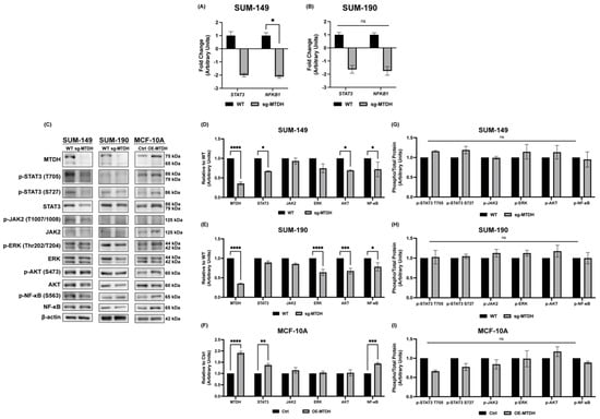 MTDH knockout decreases STAT3, NF-κB, and AKT expression. (A) STAT3 and NFKB1 qPCR for SUM-149 WT and sg-MTDH. (B) STAT3 and NFKB1 qPCR for SUM-190 WT and sg-MTDH. qPCRs were performed using HPRT and RPL13A as reference genes, and changes in gene expression were calculated using the 2−ΔΔCt method (* p < 0.05, ns: not significant). (C) Immunoblots of whole cell lysates of parental and edited cells of SUM-149, SUM-190, and MCF-10A were performed for the indicated proteins. (D–I) Densitometry quantification of total and phospho-proteins in each parental (WT or Ctrl) and edited (sg-MTDH or OE-MTDH) cell lines (SUM-149, SUM-190, and MCF-10A). After the densitometry analysis, the intensities were normalized to their loading control and plotted relative to their parental cells. A two-way ANOVA with Bonferroni’s multiple comparison test was performed; * p < 0.05, ** p < 0.01, *** p < 0.001 and **** p < 0.0001, ns: not significant. Results are shown as Mean ± SEM. The experiments were carried out at least three times.