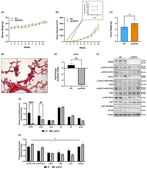 MTDH knockout delayed tumor development, reduced lung metastasis, and decreased STAT3 expression in a SUM-149 xenograft model. Xenograft IBC models were generated by injecting SUM-149 WT and SUM-149 sg-MTDH cells into SCID mice (n = 10/group). (A) The body weight of the mice and (B) the tumor volume (mm3) were monitored for 10 weeks after injection. A pairwise comparison was made to determine the difference between the groups and each week to compare the average tumor volume. Wilcoxon-Mann-Whitney tests were performed only if the data did not follow a normal distribution; ** p < 0.01, ns: not significant. (C) The tumor weight of the mice was measured at the end of the study, t-test; ns: not significant. (D) H & E staining of a lung tissue section of a tumor of the SUM-149 WT group (n = 7/group) at the end of the study shows small deposits of epithelial-like cells (arrows) in the alveolar parenchyma. Scale bar = 200 µm. (E) MTDH qPCR for tumors of SUM-149 WT and sg-MTDH mice. qPCR was performed using HPRT and RPL13A as reference genes, and changes in gene expression were calculated using the 2−ΔΔCt method (** p < 0.01). (F) Immunoblots of SUM-149 WT and sg-MTDH tumors, each lane representing a different mouse (n = 3/group). Tumor lysates were probed for the indicated proteins. (G,H) Densitometry quantification analysis of total and phospho-proteins; the intensities were normalized to its loading control and plotted. A two-way ANOVA with Bonferroni’s multiple comparison test was performed; **** p < 0.0001, ns: not significant. Results are shown as Mean ± SEM.
