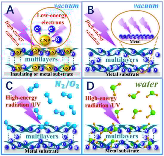 - Chen, X.; Karmaker, N.; Cloutier, P.; Zheng, Y.; Sanche, L. Low-energy electron damage to plasmid DNA in thin films: Dependence on substrates, surface charge, charging, environment and uniformity. J. Phys. Chem. B 2022, 126, 5443–5457. [Google Scholar] [CrossRef]
