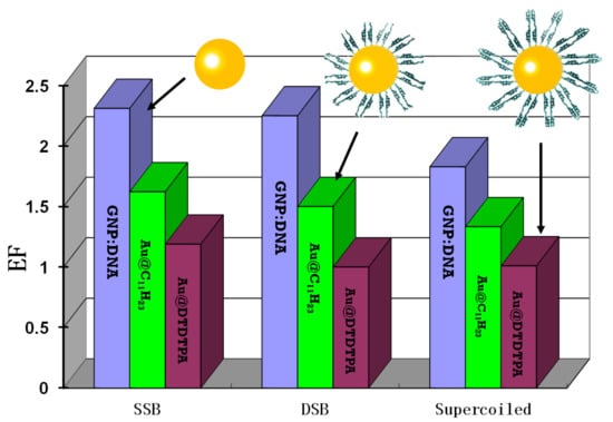 - Yao, X.; Huang, C.; Chen, X.; Zheng, Y.; Sanche, L. Chemical radiosensitivity of DNA induced by gold nanoparticles. J. Biomed. Nanotechnol. 2015, 11, 478–485. [Google Scholar] [CrossRef]