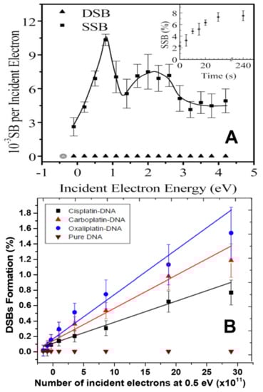 - Dong, Y.; Wang, Y.; Zhuang, P.; Fu, X.; Zheng, Y.; Sanche, L. Role of transient anions in chemoradiation therapy: Base modifications, cross-links, and cluster damages induced to cisplatin-DNA complexes by 1−20 eV electrons. J. Phys. Chem. B 2020, 124, 3315–3325. [Google Scholar] [CrossRef]