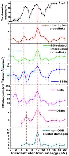 - Gao, Y.; Zheng, Y.; Sanche, L. Low-energy electron damage to condensed-phase DNA and its constituents. Int. J. Mol. Sci. 2021, 22, 7879. [Google Scholar] [CrossRef]