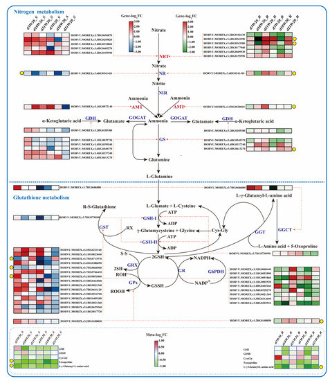 2.6. Differential Genes and Metabolites of Nitrogen Metabolism and GSH Metabolism