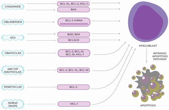 There are few scientific reports on the effect of ATO (especially in combination with decitabine) on the induction of apoptosis in MDS in vitro [,,]. In a study by Galimberti et al., in which a combination of ATO and ascorbic acid was used, an increased expression of pro-apoptotic BAD and BAX and decreased expression of anti-apoptotic BCL2L10 were noted in patients who responded to the treatment []. A limitation of the study was the small study group (12 people). ATO increases the stress exerted on the endoplasmic reticulum, which is one of the factors that induces cell apoptosis involving BCL-2 proteins [,]. However, large-group studies confirming the efficacy of ATO in MDSs have not been conducted. Currently, it seems that the interest of the scientific community is directed towards another promising group of drugs: BH3 mimetics.