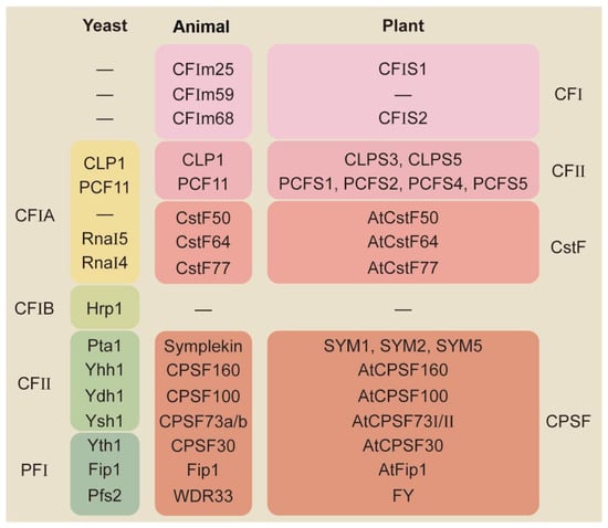 The structure of the cleavage and polyadenylation complexes from yeast and animals shares roughly similar core components, yet with some differences (Figure 1), with yeast lacking the CFI complex and Cst50 that is present in vertebrates, while vertebrates lack the Hrp1 that is in yeast [,,,,,,,]. In contrast, our understanding in higher plants relies mainly on the analysis of their homologous proteins in yeast and animals [,,,,,,,,,,]. Based on the present understanding, it seems that the overall composition of the 3′-end-processing complex from higher plants is relatively similar to that of vertebrates; it misses the CFIm59 in the CFI complex []. Another striking feature is the large number of gene duplications for genes encoding homologous proteins for the 3′-end-processing complex, especially for the homologous proteins of PCF11 and PAP1, with four each (Figure 1), which also implies that the regulatory mechanisms of polyadenylation in plants may be more exquisite and complicated [,].