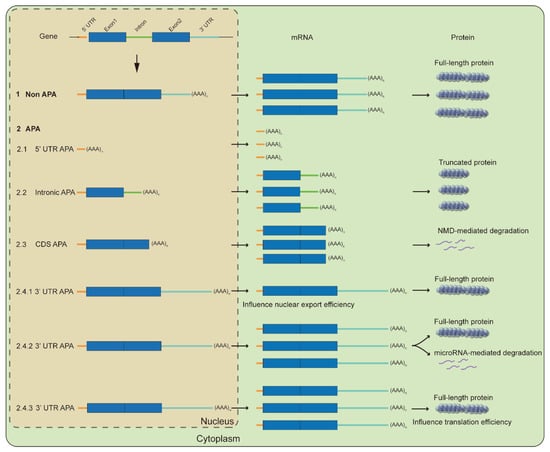 The poly(A) tail is added to the newly generated mRNA to indicate the termination of transcription and therefore determines the coding region of a protein. There are fewer studies on 5′UTR APA and CDS APA; more extensively studied is intronic APA, where polyadenylation occurring at the intron generally quickly encounters the termination codon to form a truncated protein, such that the truncated protein may be partially active or completely lose function []. Intronic APA events are common in human immune cells and severely dysregulated in cancer cells [,], suggesting an important role of intronic APA in the precise regulation of gene expression.