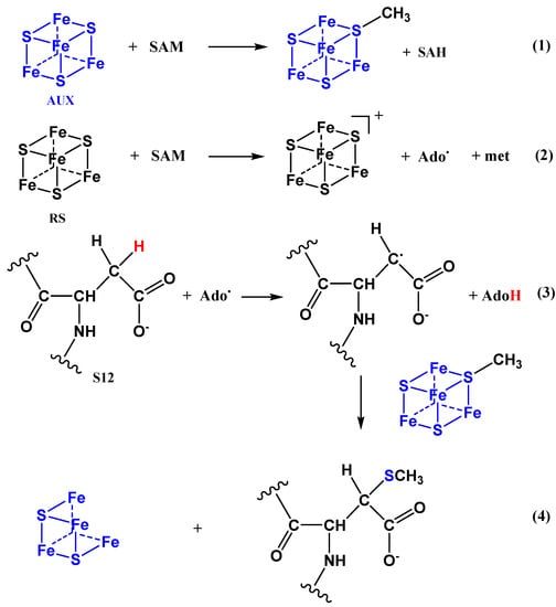 - Cheek, J.; Broderick, J.B. Adenosylmethionine-Dependent Iron-Sulfur Enzymes: Versatile Clusters in a Radical New Role. JBIC J. Biol. Inorg. Chem. 2001, 6, 209–226. [Google Scholar] [CrossRef]