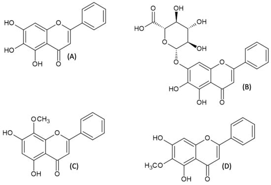 Structures of selected compounds extracted from Scutellaria baicalensis; baicalein (A), baicalin (B), wogonin (C), and oraoxilin A (D).