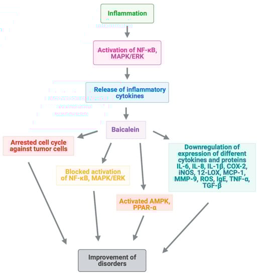 Mechanisms of baicalein action for amendment of inflammation via different signaling pathways.