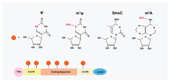 Modified mRNA is a nucleotide-modified vector, which instantly translates sufficient proteins with gradual degradation (5–7 days in vitro, 10 days in vivo) and low immunogenicity []. Commonly, chemically modified nucleotides, such as 5-methylcytidine (5meC), N6-methyladenosine (m6A), and N1-methylpseudouridine (m1ψ) have effective functions in mRNA translation (Figure 1) []. Studies have validated that both the types of fluorescent vectors [] and the pH values [] affect the translated capability of modRNA. Accordingly, enhanced green fluorescent protein (eGFP) mRNAs with m1ψ have been shown to have the most potent expression of encoded protein as compared with 5moU, ψ, and encoding firefly luciferase (FLuc) modifications []. This could be because of a reduction in immune response with antigen-specific cell-induced m1ψ modRNA [], increased ribosome loading [], augmented microRNA, and protein sensitivity []. However, eGFP coupled with 5moU has been shown to be less sensitive to RNase than other modRNA []. David et al. compared eGFP expression between nucleotide-modified RNA and unmodified RNA, and the results showed that mean protein expression increased 1.5-fold for m1Ψ modRNA in HeLa cells []. Interestingly, the temperature at neither 30 °C nor 37 °C affected the translated results, which means the temperature was independent of the translation []. Moreover, 5meC-modified mRNA had optimized protein expression at pH 5, and ψ did best at pH 7 [].