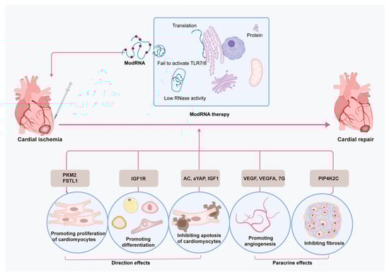 Due to these potential limitations, there has been significant interest in how to successfully transduce exogenous mRNA into cardiac cells. The aim of modRNA-based gene therapy is to achieve powerful protein translation with low immunogenicity, stability, as well as a low risk of insertional mutagenesis of exogenous mRNA []. In this review, we discuss the optimal conditions for modRNA-based therapy by using gene modification methods and selecting suitable delivery materials. Moreover, the effects and mechanisms of modRNA in MI treatment are discussed. Finally, we discuss the current challenges of modRNA-based cardiac treatment and look forward to the future direction of such treatment for MI.