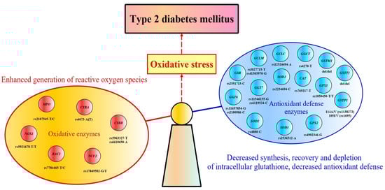 Epidemiological studies of T2D conducted over the past decades indicate that T2D is a heterogeneous disease determined by genetic, epigenetic, and environmental risk factors that closely interact with each other [7,8,9]. A huge number of genetic studies have been conducted to elucidate the molecular mechanisms of T2D, including beta-cell dysfunction, insulin resistance, imbalance in redox homeostasis, and impairment of incretin signaling; from these studies, multiple disease-associated gene polymorphisms have been identified [10,11,12,13,14]. Nonetheless, many aspects of the molecular mechanisms of disease pathogenesis remain poorly characterized. In particular, numerous studies have shown that oxidative stress (the imbalance caused by excess ROS or oxidants over the cell’s ability to realize an effective antioxidant response) resulting from an imbalance between the production of free radicals and their neutralization by antioxidant enzymes is one of the major pathological disorders underlying the development and progression of type 2 diabetes.