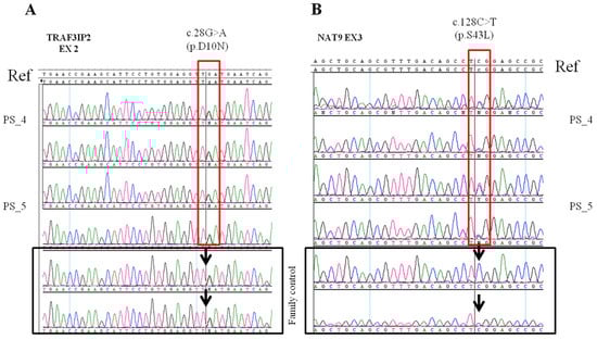The presence of the variant in the NAT9 gene was checked in the family control subject in order to determine whether there was a segregation of the variant only in the affected members or, as in the case of TRAF3IP2, also in unaffected ones. The Sanger sequencing revealed that the daughter without psoriasis was wild type for the NAT9 gene and, therefore, does not share the rs751674419 variant with her sister or her mother who were both affected by the disease (Figure 1).
