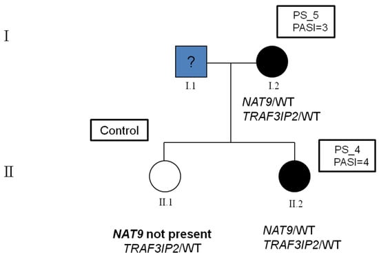 The pedigree of the family under examination and the variants found. The mother (PS_5 and PASI = 3) (proband) contracted plaque-psoriasis at 20 years of age and was found to carry both variants in TRAF3IP2 and NAT9 in a heterozygous status. Her daughter (PS_4 and PASI = 4) was affected by plaque-psoriasis at the age of 18 years and she carried the same two variants as her mother. The presence of the two variants was also checked in the family control (the non-affected daughter) and she was found to carry in the variant in TRAF3IP2 in heterozygous status but was wild type for the variant in the NAT9 gene.