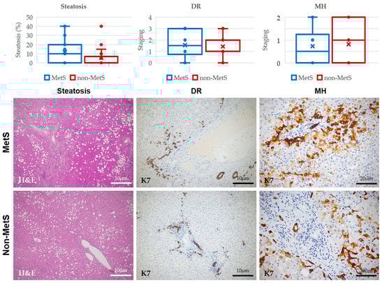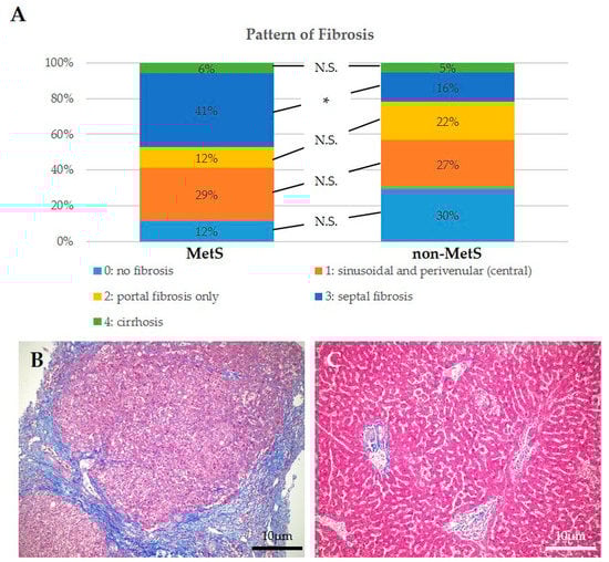2.2. Histological Analysis of Hepatic Steatosis, DR, MHs, and Fibrosis in Liver Tissue Adjacent to iCCA Showed no Significant Differences between Patients with and without MetS, though Fibrosis Patterns Were Different