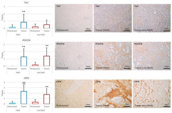 2.3. POSTN, TnC, and OPN Expression Were Significantly Increased in Tumor Compared to Peritumor Areas in Both MetS and Non-MetS iCCA; OPN Was More Expressed in MetS iCCA with Respect to Non-MetS iCCA