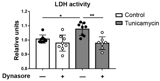 Dynasore reduces ER-stress-induced cell death. Stratified HCLE cells were incubated in DMEM with 10 μg/mL tunicamycin and 40 μM dynasore for 24 h. Equal amounts of vehicle were used in control cells and cells without dynasore. Cell medium was collected for LDH assay. The data are presented as mean ± standard deviation. * p < 0.05; ** p < 0.01.