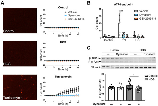 Recently it was demonstrated that the UPR is also induced by HOS [41]. We confirmed this, showing that stratified HCLE cells subjected to HOS exhibited an increase in the UPR markers sXBP1 and CHOP (Figure S1). We next examined the effects of dynasore on UPR activation in cells subjected to HOS. Representative results are shown in Figure 5. As our previous study had pointed to the PERK pathway as a specific target for dynasore activity, we first focused here. Some of the effects of PERK are mediated through activating transcription factor 4 (ATF4), which is translationally upregulated by ER stress in an eIF2α phosphorylation-dependent manner [20]. To assay ATF4 expression, we transduced HCLE monolayer cells, with an ATF4 reporter construct, which expresses a nuclear-located red fluorophore when ATF4 expression is induced by phosphorylated eIF2α. Then, HCLE cells were exposed to either HOS or tunicamycin and monitored for 16 h. The tunicamycin treatment elicited an increase in the fluorescence of the ATF4 reporter. Surprisingly, we did not find an increase in fluorescence levels in cells subjected to HOS (Figure 5A). Of note, tunicamycin’s effects were counteracted by the treatment with dynasore, as well as with the PERK inhibitor GSK2606414 (Figure 5B). In order to confirm that HOS did not induce PERK activation, we examined the phosphorylation of eIF2α. Western blot analysis showed no change in P-eIF2α when HCLE cells were exposed to HOS (Figure 5C). Despite the lack of increase in P-eIF2α, its levels were slightly reduced by dynasore.