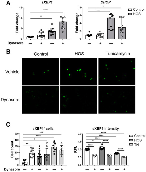 It has been described that the IRE1/sXBP1 branch can also induce an increase in CHOP expression [47,48,49]. It was intriguing, however, to find a slight increase in sXBP1 with dynasore treatment, without that being reflected in CHOP expression. This led us to investigate sXBP1 expression at a single cell level by using also a sXBP1 reporter. This reporter expresses a nuclear-localized green fluorescent protein when IRE1 performs splicing on the sXBP1 mRNA. After 24 h, the number of sXBP1+ cells was increased among the cells exposed to HOS and tunicamycin, including those treated also with dynasore (Figure 6B,C). This increase was observed also in cells treated with dynasore only. However, the intensity of staining per cell was significantly reduced by dynasore in all groups (Figure 6C). Therefore, although dynasore did not reduce the number of cells expressing sXBP1, the levels of sXBP1 per cell remained low.