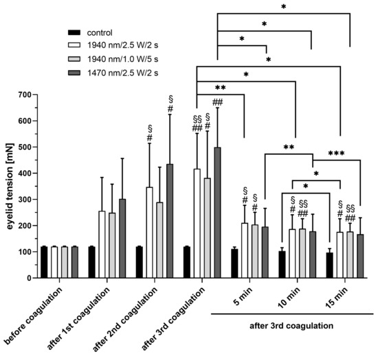 Changes in eyelid tension before and after irradiation using three different laser settings. # p < 0.05, ## p < 0.01 compared to before coagulation. § p < 0.05, §§ p < 0.01 compared with control group. * p < 0.05, ** p < 0.01, *** p < 0.001.