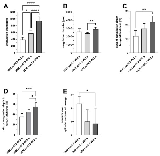 Histological results of laser coagulations of porcine eyelids in a histological cross section. (A): Depth of coagulation. (B): Diameter of coagulation (measured at the epithelium). (C): Percentage of coagulation depth to lid thickness. (D): Percentage of coagulation depth to tarsus thickness. (E): Severity of epithelial and stromal damage. * p < 0.04 ** p < 0.007 *** p < 0.002; **** p < 0.0001.