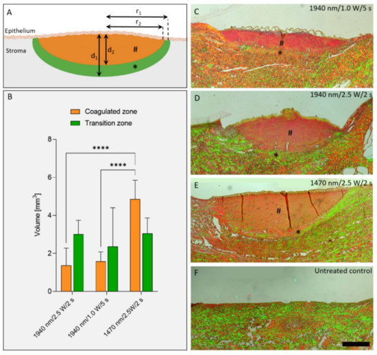 Evaluation of the thermally altered zones of laser damage of porcine eyelids. The coagulated zone (#) and the transition zone (*) was determined (A), and the volume of both zones was calculated (B) using the depth and the radius measured in Picro-Sirius-Red-stained cross-sections (C–F). In the transition zone, stronger birefringence was observed compared to the uncoagulated normal tissue. d1 = depth coagulated zone plus transition zone; d2 = depth coagulated zone; r1 = radius coagulated zone plus transition zone; r2 = radius coagulated zone. **** p < 0.0001. Scale bar: 500 µm.