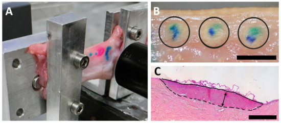 (A) Illustration of the porcine lower eyelid tissue fastened between clamps to measure the tension during the experiment (B): Laser coagulations (black circles) after application. (C): Coagulation size was determined in HE staining. Arrow: Depth of coagulation, black line: coagulation diameter, epithelial side; dashed line: coagulation diameter, stromal side. Scale bars represent 5 mm (B) and 500 µm (C).
