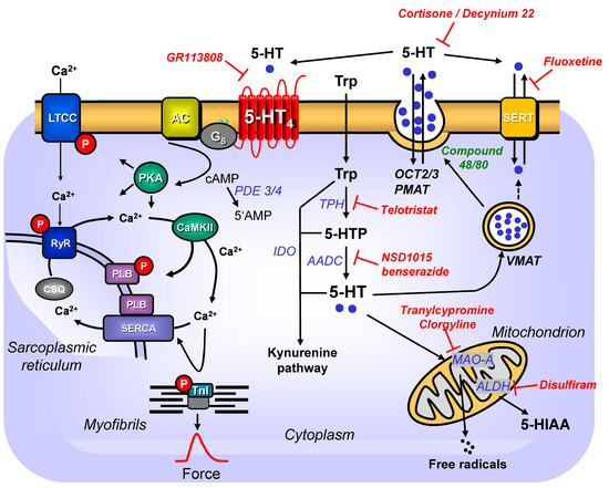5-HT can be inactivated and oxidised by monoamine oxidase-A (MAO-A). In adult mouse cardiac myocytes, levels of 5-HT were highly elevated in the presence of tranylcypromine, which inhibits MAO-A and MAO-B [36] or in the presence of clorgyline inhibits MAO-A [36] but not by deprenyl, an MAO-B-inhibitor [36]. MAO is especially active in the gut, liver, and serotoninergic nerve cells. However, MAO-A and MAO-B were also histologically detected in mouse cardiomyocytes [29,46].