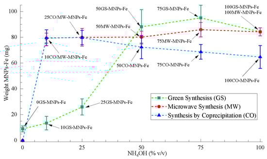 Weight curves of MNPs-Fe obtained from GS, CO, and MW with respect to the NH4OH (% v/v).