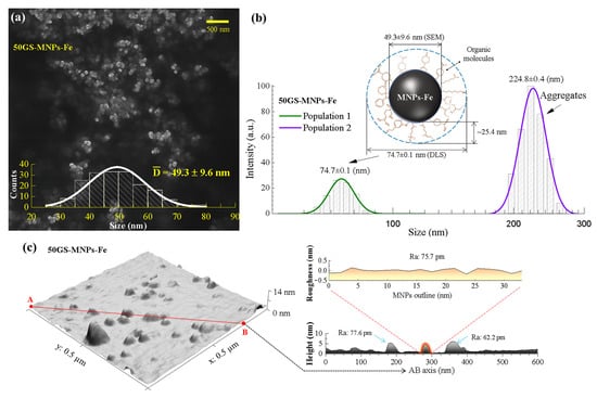 The SEM images of the samples obtained by GS allowed us to identify a quasi-spherical morphology and a normal size distribution; see Figure S2. The 50GS-MNPs-Fe sample had an average size of 49.3 ± 9.6 nm, the smallest of the GS samples (see Figure 2a). A few agglomerates were also found and neglected to determine the average size of the MNPs-Fe. DLS analysis allowed the study of the hydrodynamic diameter of the 50GS-MNPs-Fe sample. Thus, two populations of different sizes were observed; see Figure 2b. In DLS, a model based on the intensity of the scattered electric field for polydisperse particles was used, which presents intensity contributions according to the hydrodynamic radius of the populations present. Therefore, the highest intensity does not refer to the population quantity of MNPs-Fe [68]. This result corroborates that the few agglomerates observed in SEM comprised the 224.8 ± 0.4 nm population. The 74.7 ± 0.1 nm population corresponds to the 50GS-MNPs-Fe size coated with organic molecules from the orange peel extract, which is consistent with the study developed by Bano S. et al. [31]. This shell of organic molecules has a thickness of 25.4 nm, as indicated in Figure 2b. It is necessary to highlight that the SEM images show the naked MNPs-Fe.
