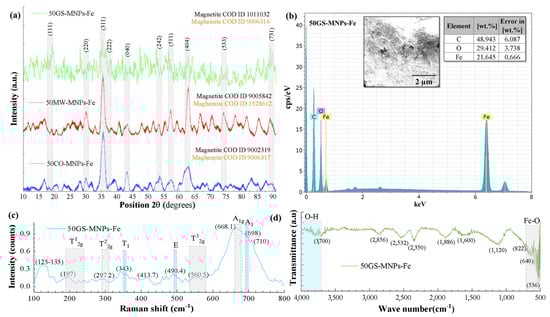 (a) XRD patterns of 50GS-MNPs-Fe, 50MW-MNPs-Fe, and 50CO-MNPs-Fe samples; 50GS-MNPs-Fe sample: (b) EDS spectrum and elemental composition (wt. %), (c) Raman spectrum between 100 and 800 cm−1 and (d) FT-IR spectrum.