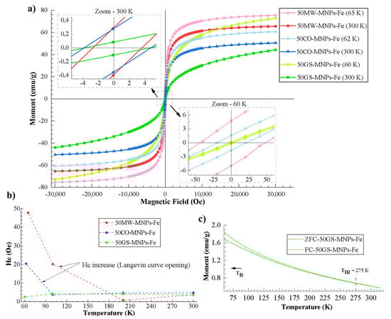 The Ms of the 50MW-MNPs-Fe sample is the highest, being 65 emu·g−1 at 300 K and 75.4 emu·g−1 at 65.5 K, followed by the values of the 50CO-MNPs-Fe sample (50.5 emu·g−1 at 300 K, 60.7 emu·g−1 at 62 K), and finally those from the 50GS-MNPs-Fe sample with a Ms of 44.1 emu·g−1 at 300 K and 72.8 emu·g−1 at 60 K. This result can be explained due to the 50MW-MNPs-Fe sample having the greatest magnetite phase (91.2%) as observed in XRD, followed by the 50CO-MNPs-Fe sample (63.5%) and then by the 50GS-MNPs-Fe sample (47.0%), which is consistent with the reported Ms of magnetite in the bulk state (90–92 emu·g−1 at 300 K) [89,90,91] and maghemite (30–80 emu·g−1 at 300 K) [92,93]. This reduction in Ms is also affected by the greater surface anisotropy (nanometric scale). Even so, it should be noted that the Ms of the 50GS-MNPs-Fe presented a significant increase at 60 K because the SPM behavior was maintained (see Figure 4a). It is also important to note that MNPs-Fe with several coherent diffracting crystalline domains (suggested by Dc in XRD) reached monodomain magnetic (SPM) status. This can occur due to the energetic ease of aligning the atomic magnetic moments in the synthesized MNPs-Fe of sizes around 49.3 nm, generating a maximum net magnetic moment for each nanoparticle.