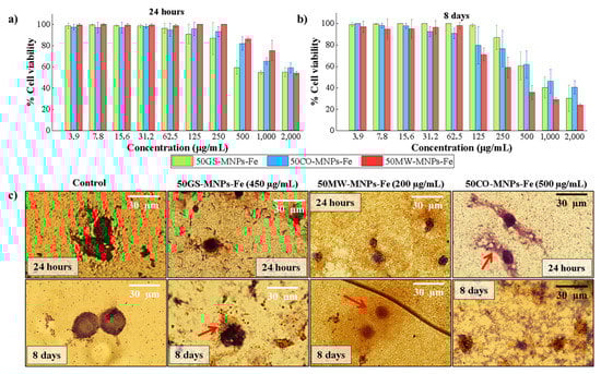 Figure 5a,b show the ATCC RAW 264.7 cell viability percentage under different concentrations (3.9–2000 µg·mL−1) of MNPs-Fe (50GS-MNPs, 50MW-MNPs-Fe, and 50CO-MNPs-Fe) for 24 h and 8 days, respectively.