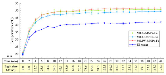 Figure 6 depicts the photothermal study of aqueous solutions with 50GS-MNPs-Fe, 50MW-MNPs-Fe, and 50CO-MNPs-Fe at concentrations of 8 mg·mL−1, including the control sample of DI water. All samples (in triplicate) were irradiated under the red light of 630 nm and 65.5 mW·cm−2 from an LED source. On the horizontal axis of Figure 6, the doses of light supplied are linked according to the irradiation times (increments of two minutes) with a total of 44 min of irradiation. All the MNPs-Fe solutions indicated that the temperature reaches a temperature threshold of 30 min. The 50GS-MNPs-Fe, 50MW-MNPs-Fe, and 50CO-MNPs-Fe reached maximum temperatures of 50.8 ± 0.2 °C, 51.7 ± 0.6 °C, and 49.6 ± 0.71 °C, respectively, while the control sample (DI water) reached 42.3 ± 0.1 °C. The photothermal effect was due to this type of nanoparticle LSPR [53]. These results indicate that all samples are suitable PTAs in the PTT for eliminating bacterial and/or tumor cells [17,55,103,104,105,106,107].