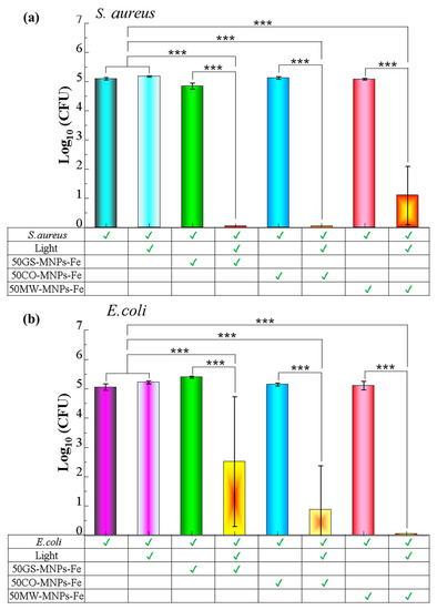 Figure 7a,b show the Log10 (CFU) count of the spread plate assays in S. aureus and E. coli bacteria, respectively. All groups were treated with MNPs-Fe (GS, MW, and CO) using a concentration of 8 mg·mL−1 of MNPs-Fe in PBS. The antibacterial activity of 50GS-MNPs-Fe against S. aureus without irradiation is small in 0.25 Log10 (CFU). Likewise, 50MW-MNPs-Fe and 50CO-MNPs-Fe without irradiation did not have significant antibacterial activity. Irradiation with a red light at 630 nm (65.5 mW·cm−2) for 30 min towards S. aureus (without MNPs-Fe) had no antibacterial effect. However, 50GS-MNPs-Fe and 50CO-MNPs-Fe with red light irradiation at 630 nm (65.5 mW·cm−2) for 30 min completely inhibited S. aureus bacteria. The 50MW-MNPs-Fe with red light irradiation at 630 nm (65.5 mW·cm−2, 30 min) inhibited 3.99 Log (CFU) of S. aureus.