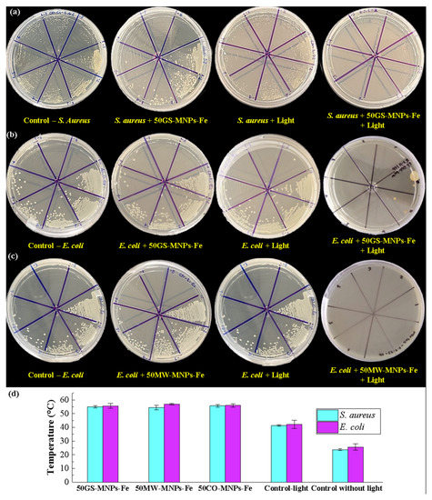 Images of the spread plate assay of the groups: (a) [Control-S. aureus], [S. aureus + 50GS-MNPs-Fe], [S. aureus + Light], [S. aureus + 50GS-MNPs-Fe + Light], (b) [Control-E. coli], [E. coli + 50GS-MNPs-Fe], [E. coli + Light], [E. coli + 50GS-MNPs-Fe + Light], (c) [Control-E. coli], [E. coli + 50MW-MNPs-Fe], [E. coli + Light], [E. coli + 50MW-MNPs-Fe + Light], (d) Temperatures reached in antibacterial PTT after irradiation with 117.9 J·cm−2 and control without irradiation.
