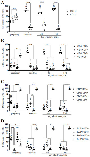 Percentages of positive cells: CD21 (A), CD4 and CD8 (B), CD25 and CD4 (C), and FoxP3 and CD4 (D) gated from total lymphocytes. Each dot represents one individual hind and means ± SEM (standard error of the mean) are presented. Statistical differences were analyzed with two-way analysis (ANOVA) of variance followed by Tukey’s post hoc test. The significance levels between gates are: * p < 0.05; ** p < 0.01, *** p < 0.001, and **** p < 0.0001 inside one experimental group. Different letters indicate statistical differences (p < 0.05) between the experimental reproductive stages.