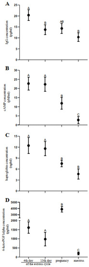 Plasma concentration of IgG (A), haptoglobin (B), cAMP (C), and 6-keto-PGF1α (D) in the blood samples collected on 4th and 13th day of the estrous cycle, and during pregnancy and anestrus. Plasma concentrations were estimated using ELISA kits, according to the manufacturer’s instructions. Statistical differences were analyzed with one-way ANOVA, followed by the Kruskal–Wallis test, using GraphPad PRISM (Version 8.3.0). The lowest statistical significance indicated by different letters (A–C) was p < 0.05.