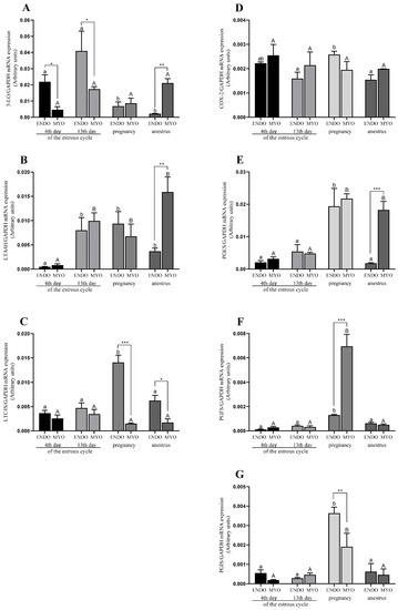 mRNA expression of 5-LO (A), LTA4H (B), LTC4S (C), PTGS2 (D), PGES (E), PGFS (F), and PGIS (G) in uterine tissues (endometrium and myometrium) on 4th and 13th day of the estrous cycle, and in pregnancy and anestrus phase. Data were normalized against GAPDH for mRNA expression using GraphPad PRISM (Version 8.3.0). Each bar represents one experimental group with SEM. Statistical differences were analyzed withy two-way analysis (ANOVA) of variance followed by Tukey’s post hoc test. The lowest statistical significance was p < 0.05. Asterisks indicate statistical differences between endometrium and myometrium (* p < 0.05; ** p < 0.01; *** p < 0.001). Different letters indicate statistical differences (p < 0.05) between the experimental reproductive stages throughout endometrium (a, b) and myometrium (A, B), respectively.