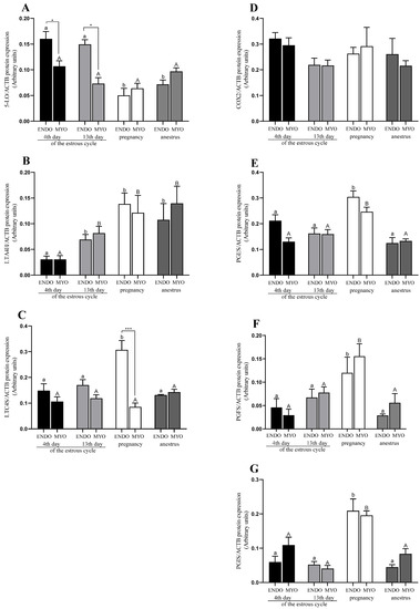Protein expression of 5-LO (A), LTA4H (B), LTC4S (C), PTGS2 (D), PGES (E), PGFS (F), and PGIS (G) in uterine tissues (endometrium and myometrium) on 4th and 13th day of the estrous cycle, and in pregnancy and anestrus phase. Data were normalized against ACTB for protein expression using GraphPad PRISM (Version 8.3.0). Each bar represents one experimental group with SEM. Statistical differences were analyzed with two-way analysis (ANOVA) of variance followed by Tukey’s post hoc test. The lowest statistical significance was p < 0.05. Asterisks indicate statistical differences between endometrium and myometrium (* p < 0.1; *** p < 0.001). Different letters indicate statistical differences (p < 0.05) between the experimental reproductive stages throughout endometrium (a, b) and myometrium (A, B), respectively.