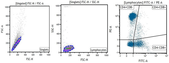 Monoclonal antibodies with adequate fluorochromes were tested for labelling the CD4 (CVS4, BioRad, Hercules, CA, USA), CD8 (CVS21, BioRad, Hercules, CA, USA), CD21 (CC21, BioRad, Hercules, CA, USA), CD25 (IL-A111, BioRad, Hercules, CA, USA), and FoxP3 (FJK-16s, Life Technologies, Bleiswijk, The Netherlands; Table 1). The appropriate amount and concentration of each antibody was determined empirically in order to obtain optimal labelling results. The controls included unlabeled cells, and FMO (fluorescence minus one) and “switch-off” approach (SWOFF) controls were performed if necessary. For the analysis of lymphocytes, only non-adherent cells were collected. The cells were incubated with antibodies for 20 min at 4 °C in eBioscience™ Flow Cytometry Staining Buffer (Life Technologies, Bleiswijk, The Netherlands) in the dark. After that, the cells were washed twice with 2% BSA, resuspended in 200 μL of flow cytometry staining buffer, and immediately introduced into the cytometer. For FoxP3 staining, the eBioscience™ Foxp3/Transcription Factor Staining Buffer Set (Life Technologies, Bleiswijk, The Netherlands) was used according to the manufacturer’s protocol. The analysis was performed by setting the gate on single cells on the FSC-area (FSC-A) vs. FSC-high (FSC-H) dot plot. Based on the FSC and SSC dot plots, the lymphocytes were gated (Figure 5). The flow cytometric analysis was performed using a FACSCanto II flow cytometer and the Kaluza Flow Cytometry Analysis Software (Beckman Coulter, Brea, CA, USA).