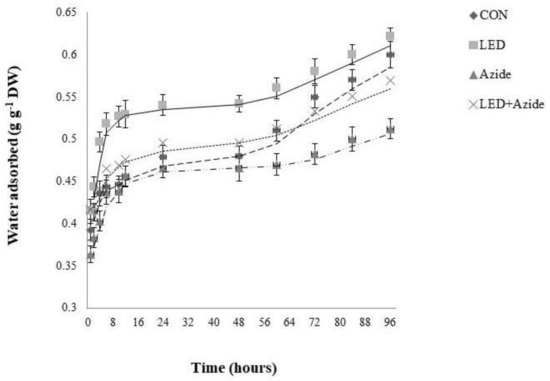 A total of 50 seeds were placed in Petri dishes with moist Whatman paper. Before measuring the kinetic of water adsorption, half of the seeds from each treatment (CON and R LED-irradiated seeds) were immersed in sodium azide (NaN3) at a final concentration of 7 mM [48]. The seeds were maintained under NaN3 immersion during the first hour of imbibition to allow the azide to penetrate through the seed coat. After that and for the rest of time-course of measurement of water imbibition, the seeds were placed in distilled water in order to avoid azide toxicity.