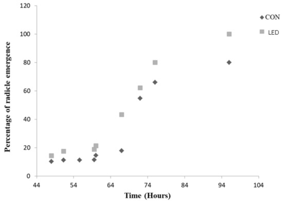 Percentage of radicle emergence (from 48 h to 96 h) in Control (CON, unlighted) and irradiated R LED (LED) pepper seeds after Phases I and II of germination.