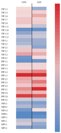 Heat-map representation of TIP, PIP, NIP, SIP, and XIP isoforms expression in Control (CON, unlighted) and irradiated R LED (LED) pepper seeds, after radicle emergence during germination (at 96 h of imbibition), as compared to the NIP1;1 (lower expression) of each treatment. Data are means of three repetitions (n = 3).