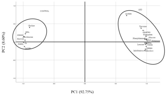 For a better and simpler visual interpretation of all the data (metabolites for the different experimental repetitions of Control and R LED-irradiated seeds), a principal component analysis (PCA) was conducted (Figure 6). The PC1 component explained 92.75% of the variability observed, showing that the variability was fundamentally due to acetate, Tyr, Asp, Trp, Phe, Val, Glu, Leu, glucose, malate, citrate, SA, and IBA in R LED-irradiated seeds. PC2 (8.60%) was positively associated with Control seeds and metabolites as choline, ABA, ALA, ILE, GABA, sucrose, JA, and lactate were represented.