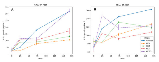 Each reaction of the plant organism begins with a local reaction at the point of exposure to elicitors. The first reaction upon contact with pathogenic and non-pathogenic micro-organisms is the disturbance of the oxidative status of the plant. Initially, plant–microbe interaction induces an oxidative burst locally with the release of reactive oxygen species, which also includes H2O2 [16,23,57,58]. This fact was also confirmed in our research, because 24 h after inoculation we observed an increase in the content of H2O2 (Figure 1). The induction of ROS is a significant signaling in control of various processes including immunity against pathogens, programmed cell death, and stomatal closure [59]. Owing to its relative stability compared to other ROS and its capacity for diffusing through aquaporins in the membranes and over more considerable distances within the cell, H2O2 acts as a stress signal transducer and contributes to numerous physiological functions in plants [60].
