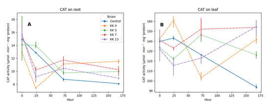 Effect of selected rhizobacteria on catalase activity (CAT, EC 1.11.1.6) in root (A) and leaves (B) of 5-week-old M. truncatula J5 seedlings at 24, 72 and 168 h after inoculation.