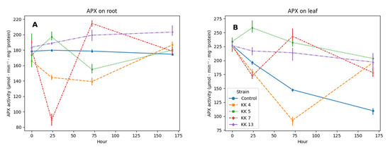24 h after inoculation with bacteria in the roots of two strains, Pseudomonas brassicacearum KK5 and Sinorhizobium meliloti KK13 caused a slight (10% and 5%, respectively) increase in APX activity, and the next two strains, Paenibacillus borealis KK4 and Pseudomonas corrugata KK7, inhibited the activity of this enzyme by 20 and 50% (Figure 3A). On the third day after inoculation, strain KK4 still reduced peroxidase activity by 22%. The KK5 strain decreased APX activity by 13%, the other two strains caused an increase in the activity of this enzyme by 20% after treatment with KK7 and 11% after inoculation with KK13. On the 7th day after inoculation, strains of Paenibacillus borealis KK4 and Sinorhizobium meliloti KK13, induced it by 7% and 16%, respectively.